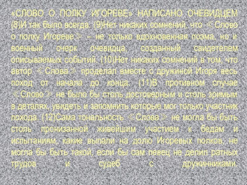 Игореве≫ – не только вдохновенная поэма, но и военный очерк очевидца, созданный свидетелем описываемых событий. (10)Нет никаких сомнений в том, что автор ≪Слова≫ проделал вместе с дружиной Игоря весь поход от начала до конца. (11)В противном случае ≪Слово≫ не было бы столь достоверным и столь зримым в деталях, увидеть и запомнить которые мог только участник похода. (12)Сама тональность ≪Слова≫ не могла бы быть столь пронизанной живейшим участием к бедам и испытаниям, какие выпали на долю Игоревых полков, не могла бы быть такой, если бы сам певец не делил ратных трудов и судеб с дружинниками.