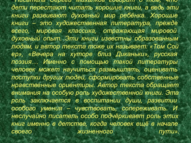 Слайд 28«Писатель Сергей Михалков говорит о том, что дети перестают читать хорошие