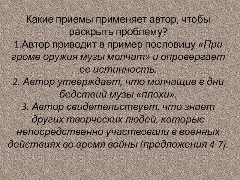 пословицы «При громе оружия музы молчат». И. Бражин говорит, что «плохи музы, которые в дни великих народных бедствий могут молчать…». По мнению автора, всегда были творческие люди, которые непосредственно участвовали в боевых действиях (предложения 4-7). В качестве примера, подтверждающего его точку зрения, В. Бражин приводит историю создателя «Слова о полку Игореве», «который проделал вместе с дружиной Игоря весь поход от начала до конца». Продолжая систему аргументов, автор говорит о традициях «певцов-воинов» от Дениса Давыдова до поэтов и прозаиков Великой Отечественной войны 1941-1945 годов. В заключение автор приходит к выводу, что многие творческие люди во все времена отдавали «кровному делу не только свое перо, но и … саму жизнь».