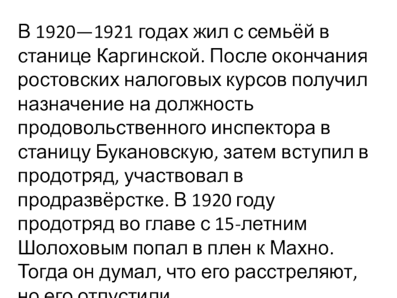 Слайд 7В 1920—1921 годах жил с семьёй в станице Каргинской. После окончания
