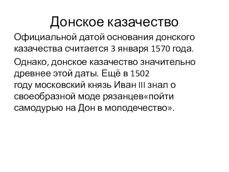 казачество значительно древнее этой даты. Ещё в 1502 году московский князь Иван III знал о своеобразной моде рязанцев«пойти самодурью на Дон в молодечество».
