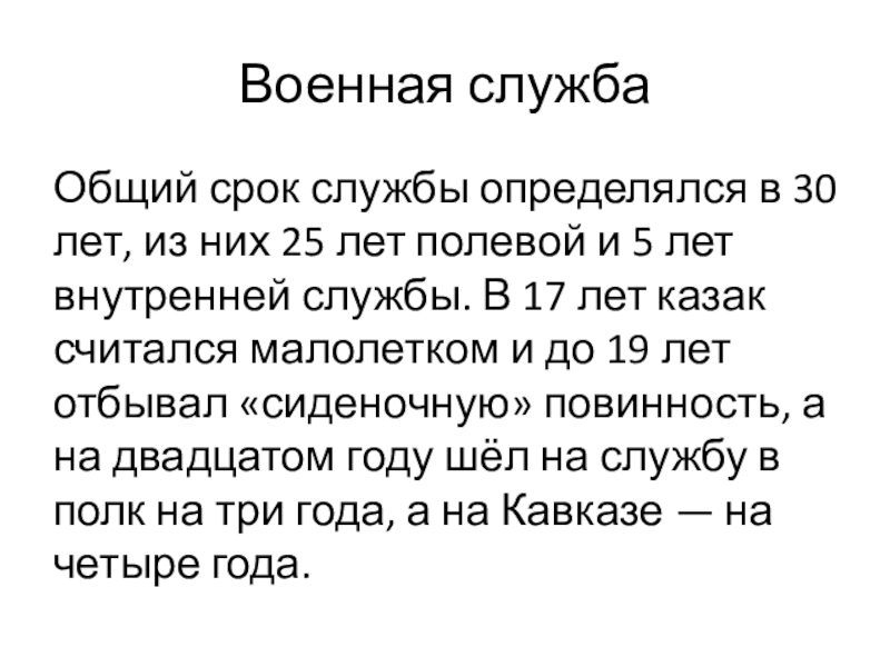 лет полевой и 5 лет внутренней службы. В 17 лет казак считался малолетком и до 19 лет отбывал «сиденочную» повинность, а на двадцатом году шёл на службу в полк на три года, а на Кавказе — на четыре года.