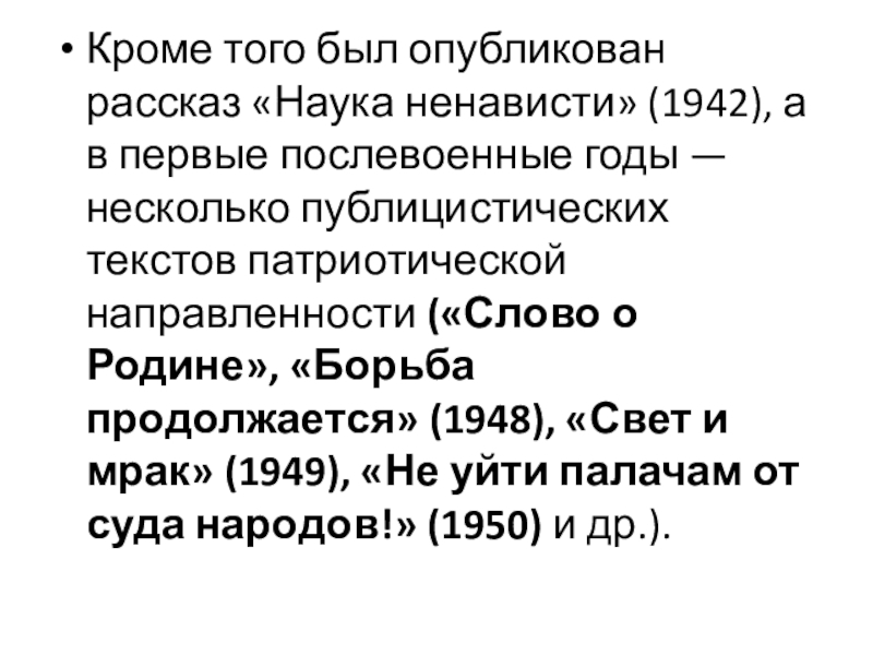 Слайд 15Кроме того был опубликован рассказ «Наука ненависти» (1942), а в первые