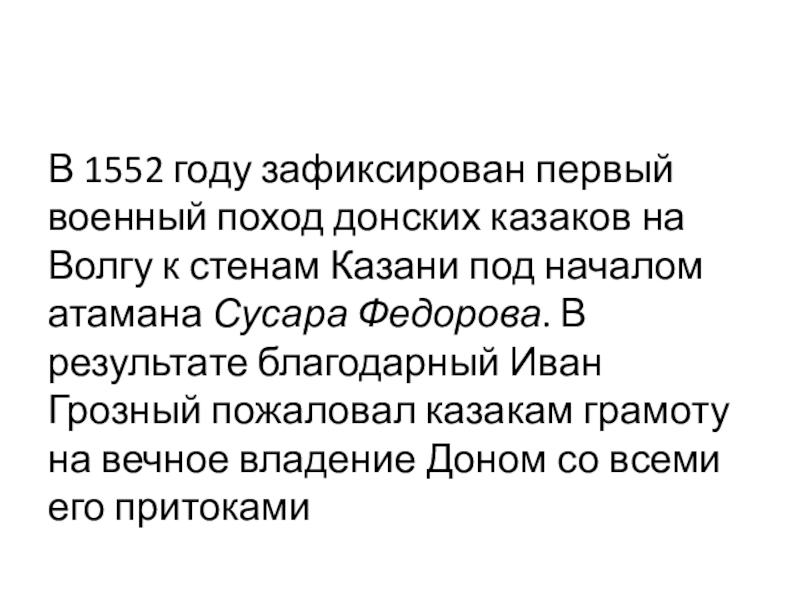 Казани под началом атамана Сусара Федорова. В результате благодарный Иван Грозный пожаловал казакам грамоту на вечное владение Доном со всеми его притоками