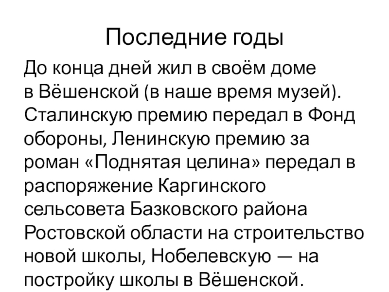 время музей). Сталинскую премию передал в Фонд обороны, Ленинскую премию за роман «Поднятая целина» передал в распоряжение Каргинского сельсовета Базковского района Ростовской области на строительство новой школы, Нобелевскую — на постройку школы в Вёшенской.