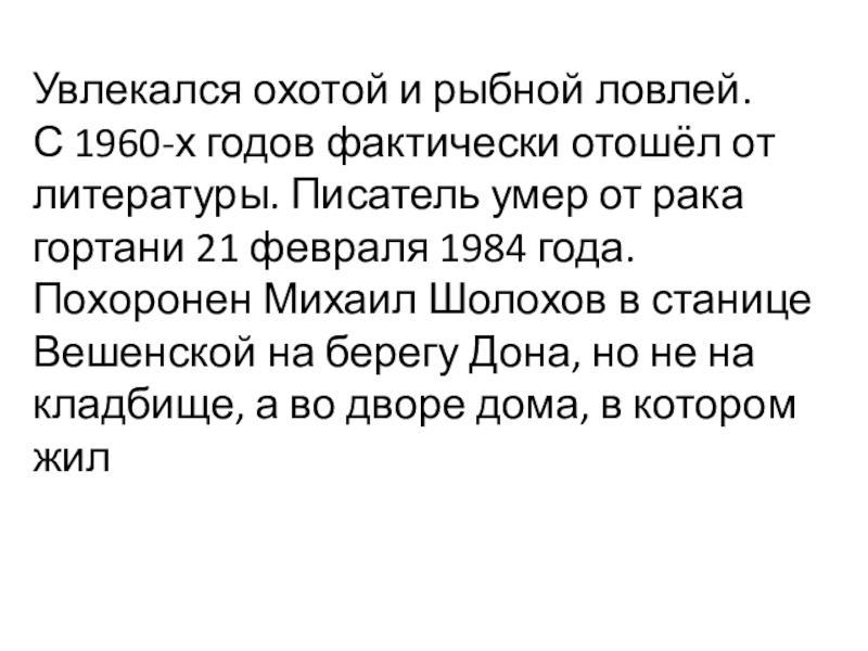 умер от рака гортани 21 февраля 1984 года. Похоронен Михаил Шолохов в станице Вешенской на берегу Дона, но не на кладбище, а во дворе дома, в котором жил