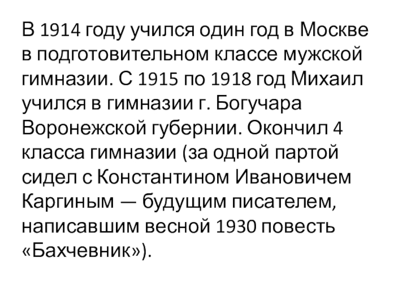 мужской гимназии. С 1915 по 1918 год Михаил учился в гимназии г. Богучара Воронежской губернии. Окончил 4 класса гимназии (за одной партой сидел с Константином Ивановичем Каргиным — будущим писателем, написавшим весной 1930 повесть «Бахчевник»).
