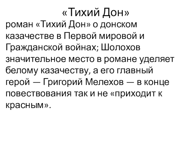 Гражданской войнах; Шолохов значительное место в романе уделяет белому казачеству, а его главный герой — Григорий Мелехов — в конце повествования так и не «приходит к красным».