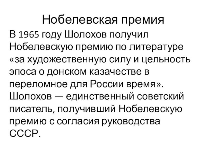 и цельность эпоса о донском казачестве в переломное для России время». Шолохов — единственный советский писатель, получивший Нобелевскую премию с согласия руководства СССР.