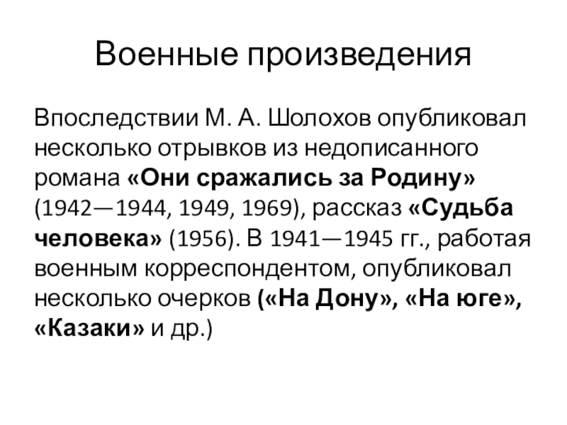«Они сражались за Родину» (1942—1944, 1949, 1969), рассказ «Судьба человека» (1956). В 1941—1945 гг., работая военным корреспондентом, опубликовал несколько очерков («На Дону», «На юге», «Казаки» и др.)