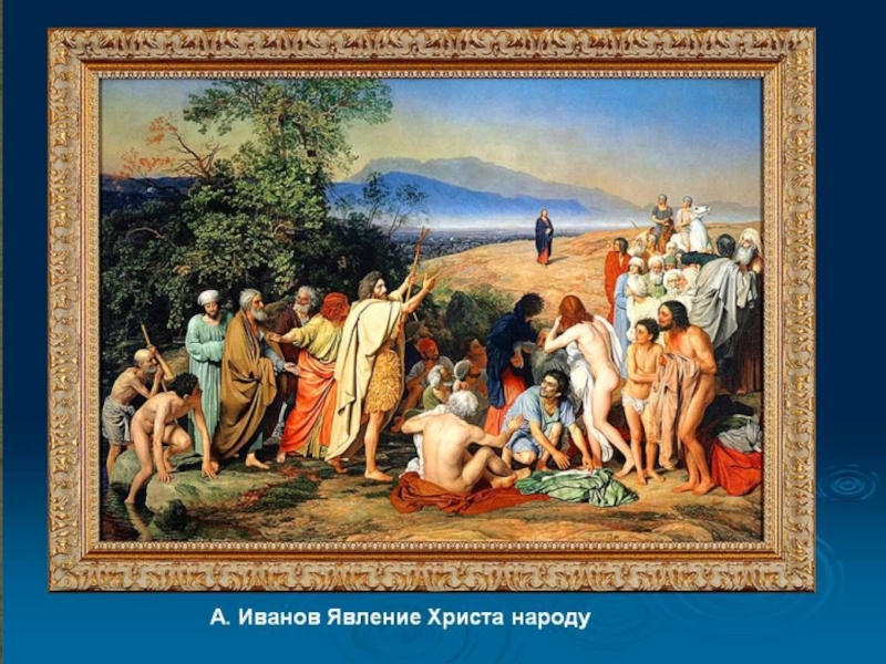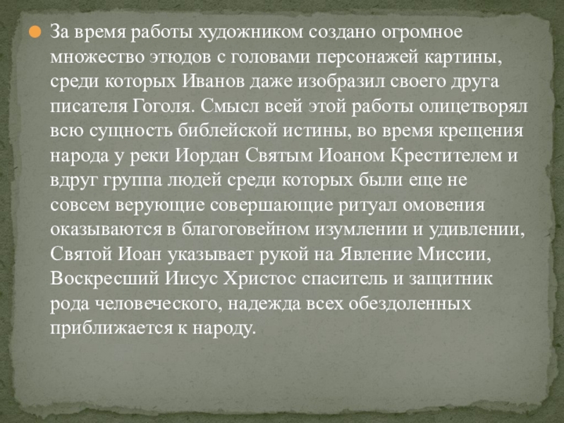 картины, среди которых Иванов даже изобразил своего друга писателя Гоголя. Смысл всей этой работы олицетворял всю сущность библейской истины, во время крещения народа у реки Иордан Святым Иоаном Крестителем и вдруг группа людей среди которых были еще не совсем верующие совершающие ритуал омовения оказываются в благоговейном изумлении и удивлении, Святой Иоан указывает рукой на Явление Миссии, Воскресший Иисус Христос спаситель и защитник рода человеческого, надежда всех обездоленных приближается к народу.