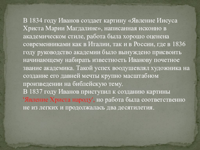 В 1837 году Иванов приступил к созданию картины 'Явление Христа народу', но работа была соответственно не из легких и продолжалась два десятилетия.