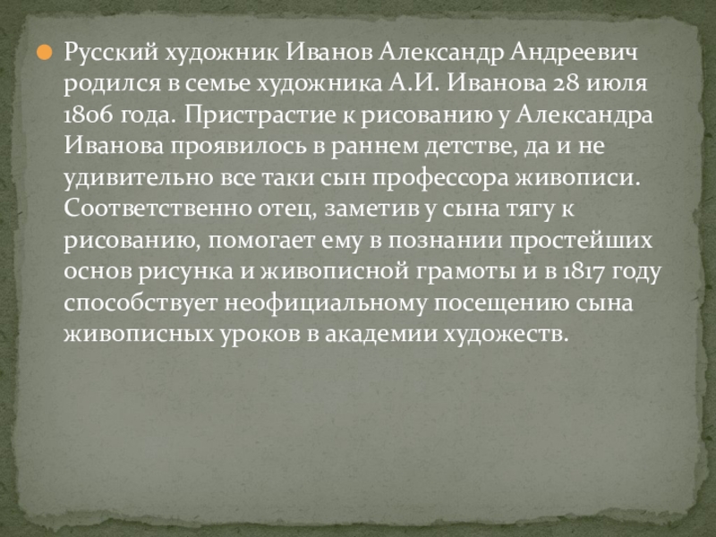 Русский художник Иванов Александр Андреевич родился в семье художника А.И. Иванова 28 июля 1806 года. Пристрастие к