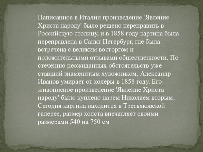 Российскую столицу, и в 1858 году картина была переправлена в Санкт Петербург, где была встречена с великим восторгом и положительными отзывами общественности. По стечению неожиданных обстоятельств уже ставший знаменитым художником, Александр Иванов умирает от холеры в 1858 году. Его живописное произведение 'Явление Христа народу' было куплено царем Николаем вторым. Сегодня картина находится в Третьяковской галерее, размер холста впечатляет своими размерами 540 на 750 см