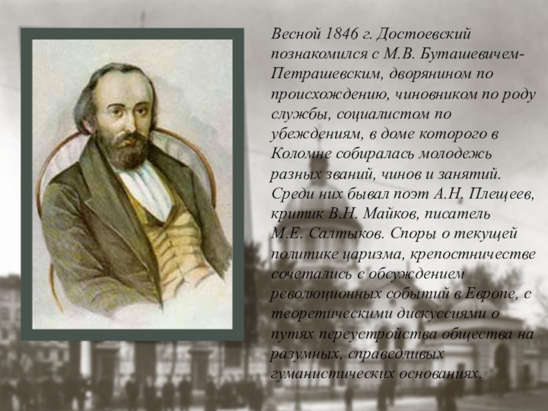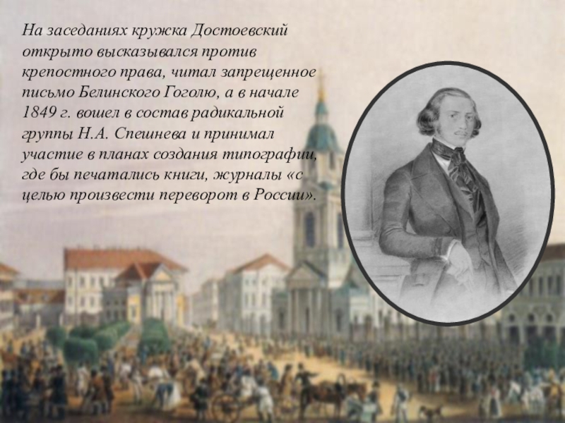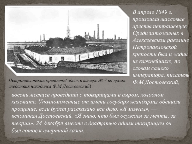В апреле 1849 г. произошли массовые аресты петрашевцев. Среди заточенных в Алексеевском равелине Петропавловской крепости был и «один из важнейших», по словам самого императора, писатель Ф.М.Достоевский,