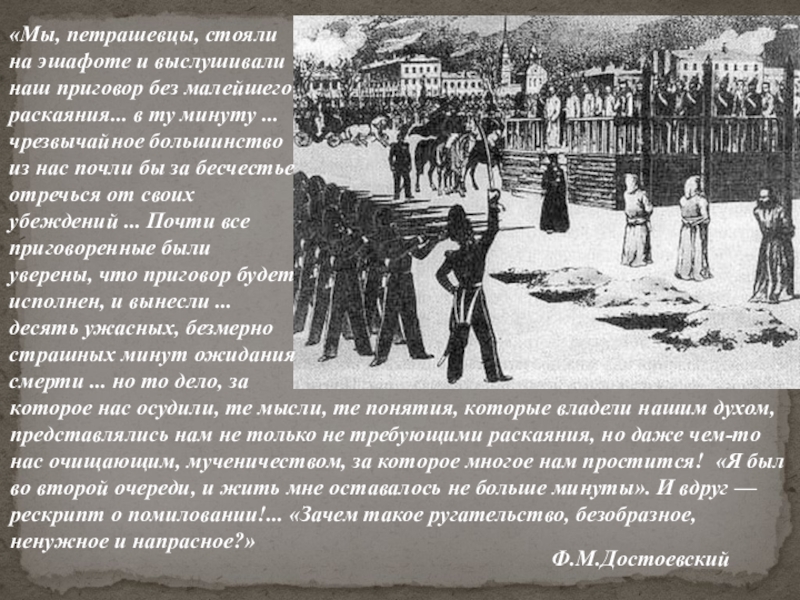 восемь месяцев проведший с товарищами в сыром, холодном каземате. Уполномоченные от имени государя жандармы обещали прощение, если будет рассказано все дело. «Я молчал», — вспоминал Достоевский. «Я знаю, что был осужден за мечты, за теории». 24 декабря вместе с двадцатью одним товарищем он был готов к смертной казни.