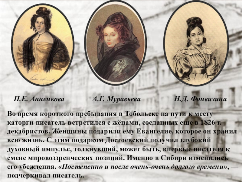Во время короткого пребывания в Тобольске на пути к месту каторги писатель встретился с жёнами, сосланных еще в 1826 г. декабристов. Женщины подарили ему Евангелие, которое он хранил всю жизнь. С этим подарком Достоевский получил глубокий духовный импульс, толкнувший, может быть, впервые писателя к смене мировоззренческих позиций. Именно в Сибири изменились его убеждения. «Постепенно и после очень-очень долгого времени», — подчеркивал писатель.