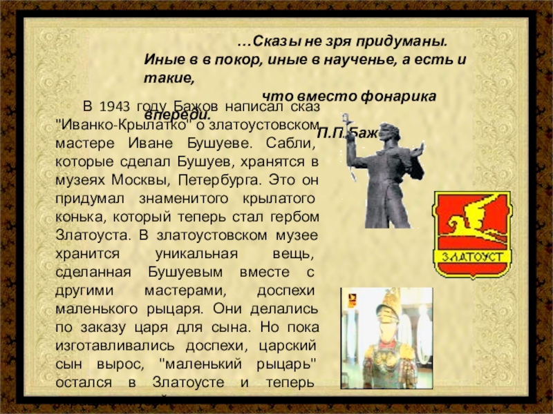 В 1943 году Бажов написал сказ "Иванко-Крылатко" о златоустовском мастере Иване Бушуеве. Сабли, которые сделал Бушуев, хранятся в музеях Москвы, Петербурга. Это он придумал знаменитого крылатого конька, который теперь стал гербом Златоуста. В златоустовском музее хранится уникальная вещь, сделанная Бушуевым вместе с другими мастерами, доспехи маленького рыцаря. Они делались по заказу царя для сына. Но пока изготавливались доспехи, царский сын вырос, "маленький рыцарь" остался в Златоусте и теперь украшает музей.