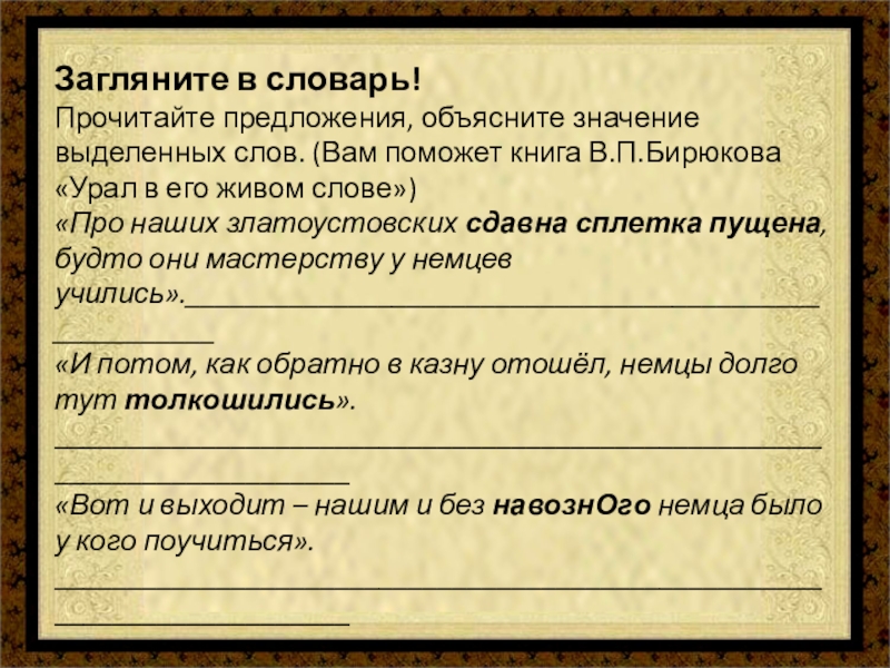 «Про наших златоустовских сдавна сплетка пущена, будто они мастерству у немцев учились».______________________________________________________