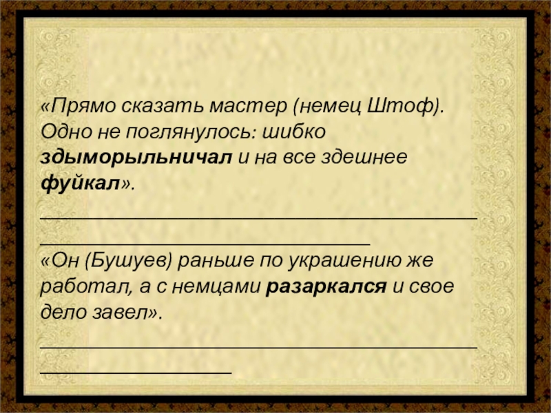 Слайд 18«Прямо сказать мастер (немец Штоф). Одно не поглянулось: шибко здыморыльничал и