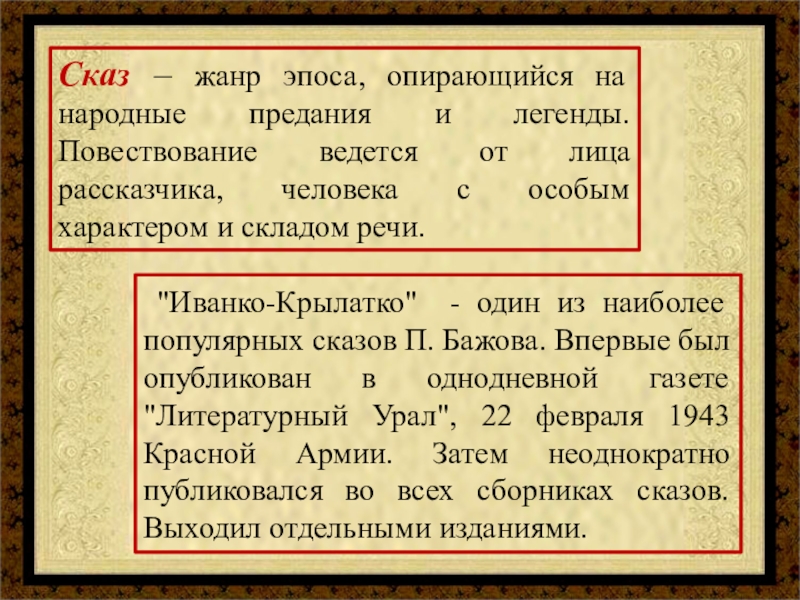 Слайд 16Сказ – жанр эпоса, опирающийся на народные предания и легенды. Повествование