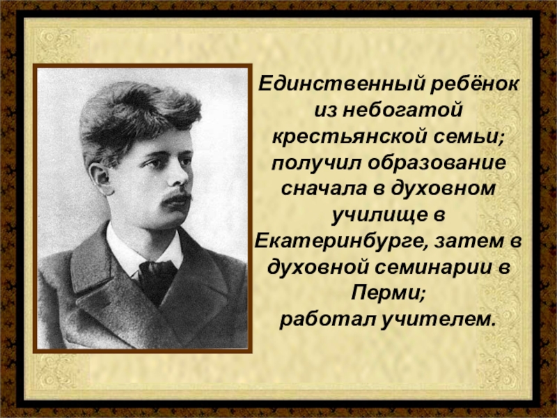 Слайд 8Единственный ребёнок из небогатой крестьянской семьи;