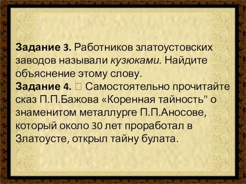 Задание 4. Самостоятельно прочитайте сказ П.П.Бажова «Коренная тайность" о знаменитом металлурге П.П.Аносове, который около 30 лет проработал в Златоусте, открыл тайну булата.
