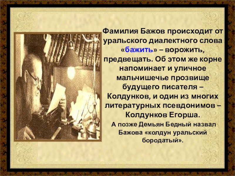 Слайд 7Фамилия Бажов происходит от уральского диалектного слова «бажить» – ворожить, предвещать.
