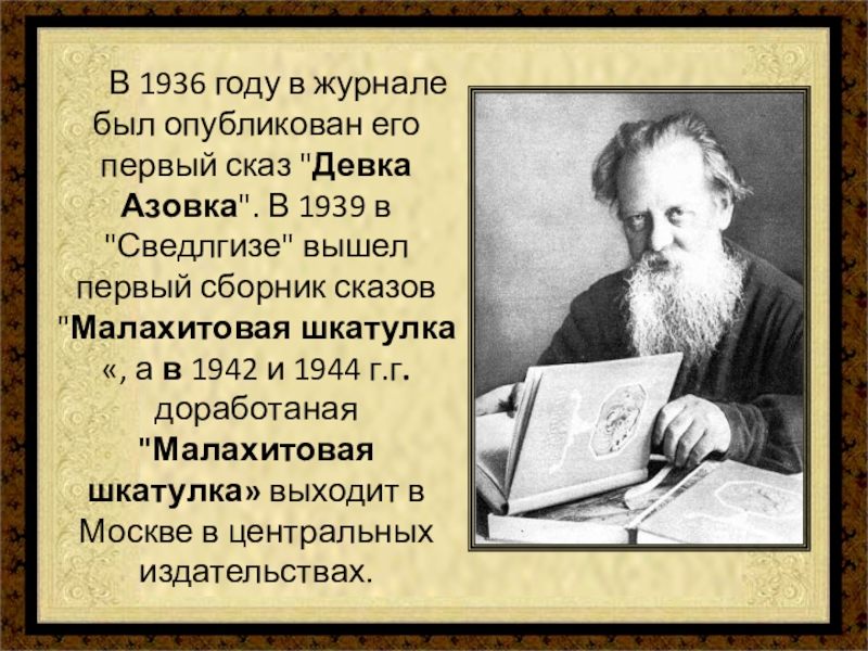 Азовка". В 1939 в "Сведлгизе" вышел первый сборник сказов "Малахитовая шкатулка«, а в 1942 и 1944 г.г. доработаная "Малахитовая шкатулка» выходит в Москве в центральных издательствах.