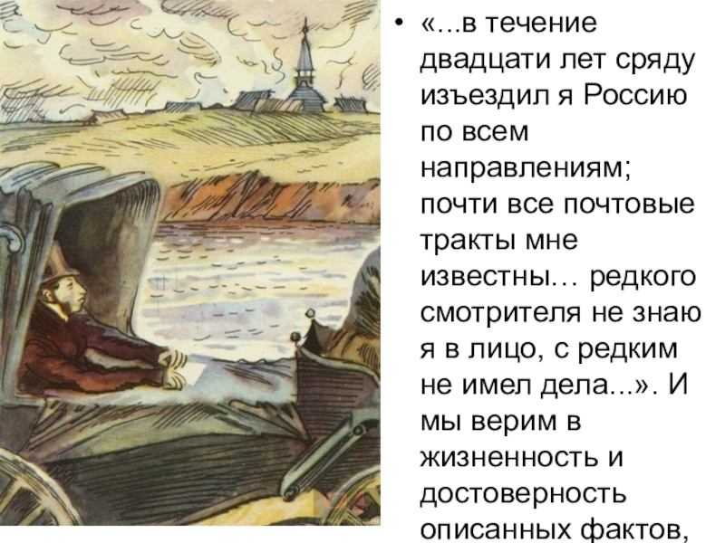 почти все почтовые тракты мне известны… редкого смотрителя не знаю я в лицо, с редким не имел дела...». И мы верим в жизненность и достоверность описанных фактов, характеров.