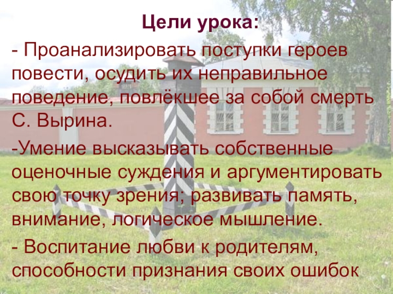 - Проанализировать поступки героев повести, осудить их неправильное поведение,