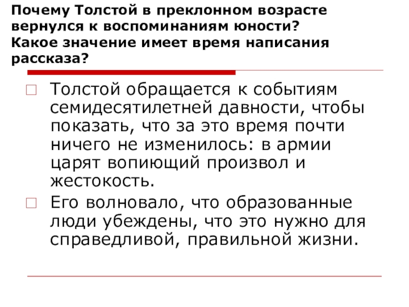 Толстой обращается к событиям семидесятилетней давности, чтобы показать, что за это время почти ничего не изменилось: в армии царят вопиющий произвол и жестокость.