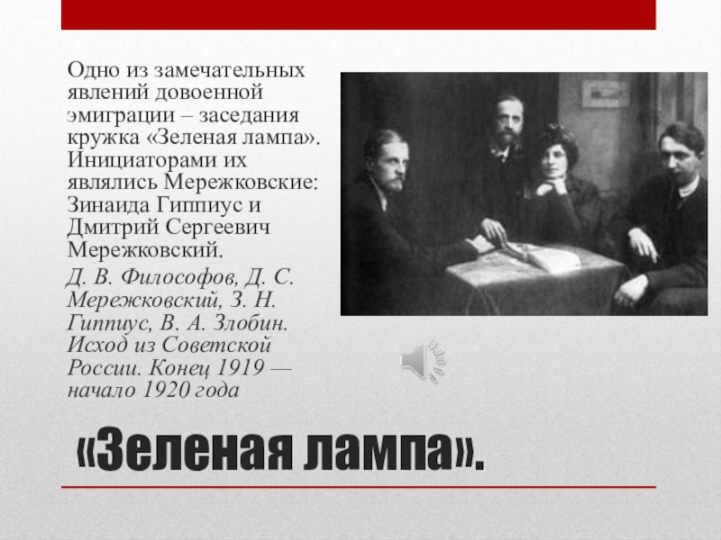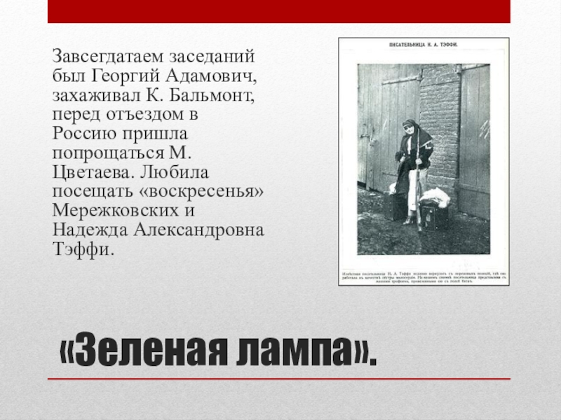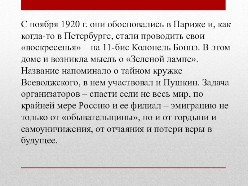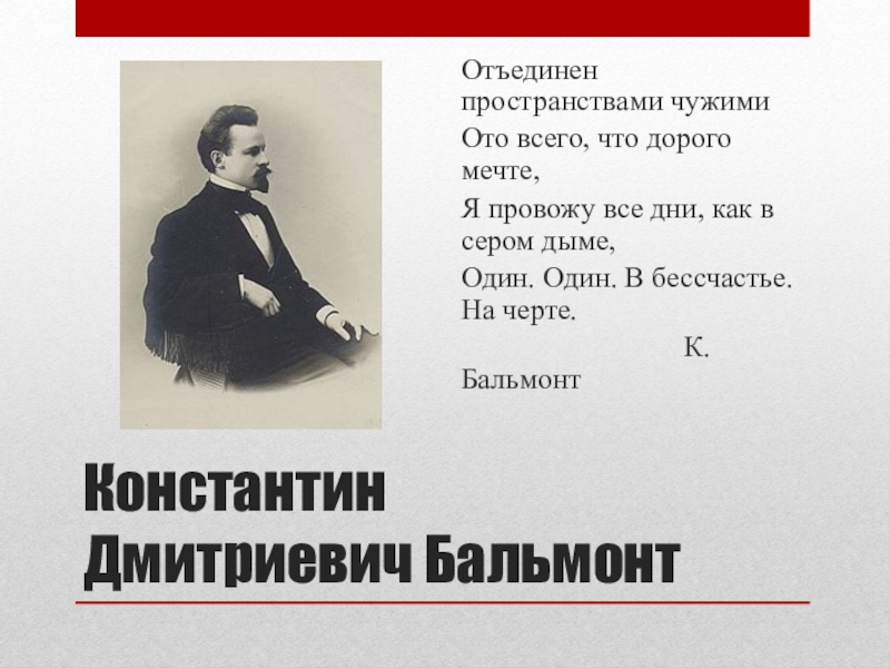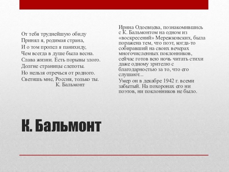Ирина Одоевцева, познакомившись с К. Бальмонтом на одном из «воскресений» Мережковских, была поражена тем, что поэт, когда-то собиравший на своих вечерах многочисленных поклонников, сейчас готов всю ночь читать стихи даже одному зрителю с благодарностью за то, что его слушают...