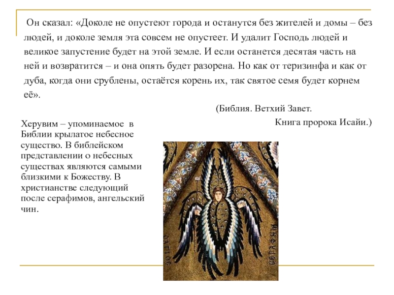 Херувим – упоминаемое в Библии крылатое небесное существо. В библейском представлении ο небесных существах являются самыми близкими к Божеству. В христианстве следующий после серафимов, ангельский чин.