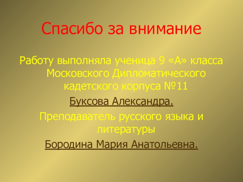 Работу выполняла ученица 9 «А» класса Московского Дипломатического кадетского