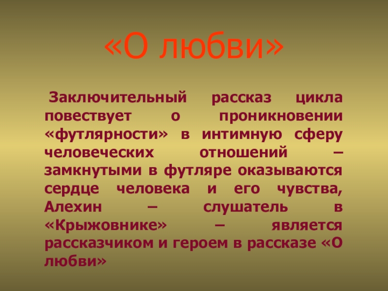 человеческих отношений – замкнутыми в футляре оказываются сердце человека и его чувства, Алехин – слушатель в «Крыжовнике» – является рассказчиком и героем в рассказе «О любви»