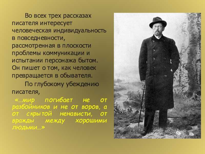 Слайд 27 Во всех трех рассказах писателя интересует человеческая индивидуальность в повседневности, рассмотренная