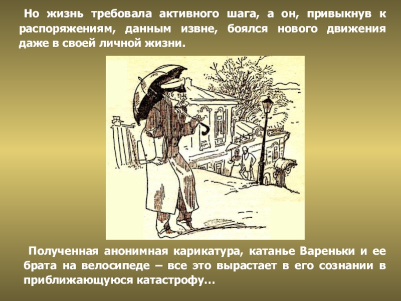 Слайд 12 Полученная анонимная карикатура, катанье Вареньки и ее брата на велосипеде –