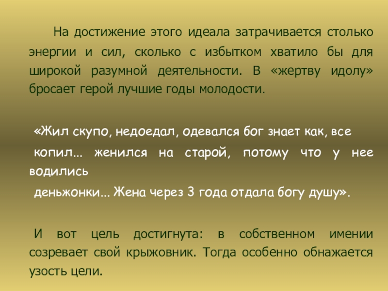 избытком хватило бы для широкой разумной деятельности. В «жертву идолу» бросает герой лучшие годы молодости.