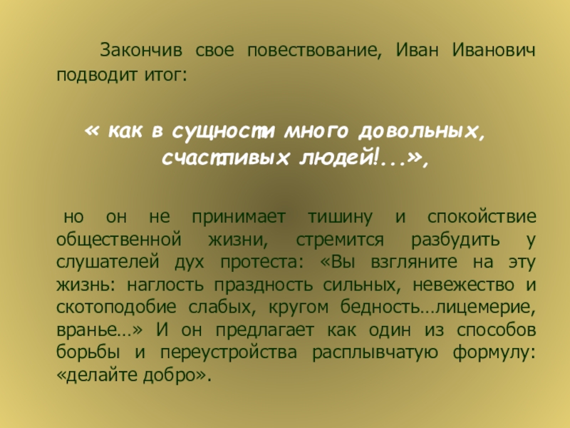 Слайд 20 Закончив свое повествование, Иван Иванович подводит итог: