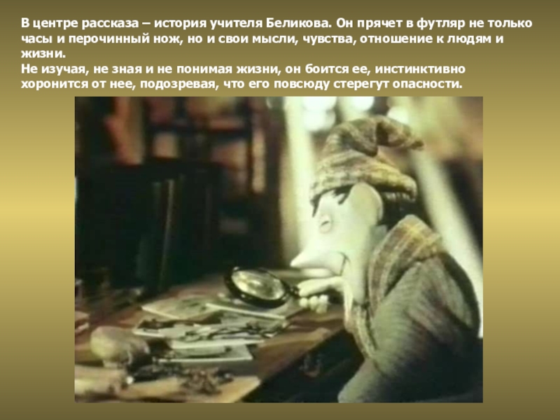 Слайд 10В центре рассказа – история учителя Беликова. Он прячет в футляр