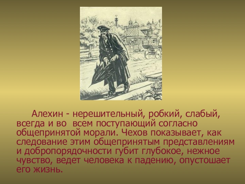 Слайд 22 Алехин - нерешительный, робкий, слабый, всегда и во всем поступающий согласно