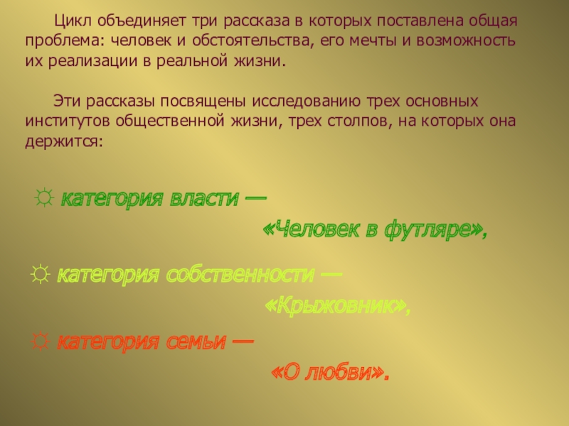 Слайд 5 Цикл объединяет три рассказа в которых поставлена общая проблема: человек и