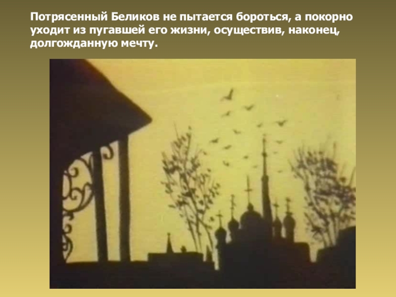 Слайд 14Потрясенный Беликов не пытается бороться, а покорно уходит из пугавшей его