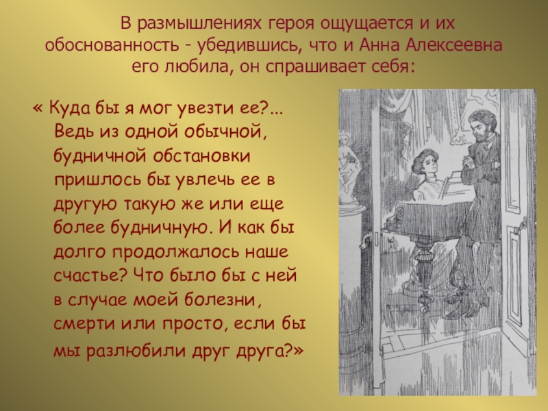 « Куда бы я мог увезти ее?... Ведь из одной обычной, будничной обстановки пришлось бы увлечь ее в другую такую же или еще более будничную. И как бы долго продолжалось наше счастье? Что было бы с ней в случае моей болезни, смерти или просто, если бы мы разлюбили друг друга?»