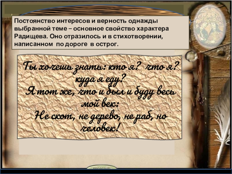 Вернувшись в Россию, А. Н. Радищев поступил на службу. Он старался везде и во всем действовать по совести и, став начальником Петербургской таможни, получил орден Святого Владимира из рук императрицы и заслужил уважение лучших людей своей эпохи. На каждом шагу Радищев встречался с проявлениями самовластья, произвола, деспотизма, с которыми его сердце мириться не желало.