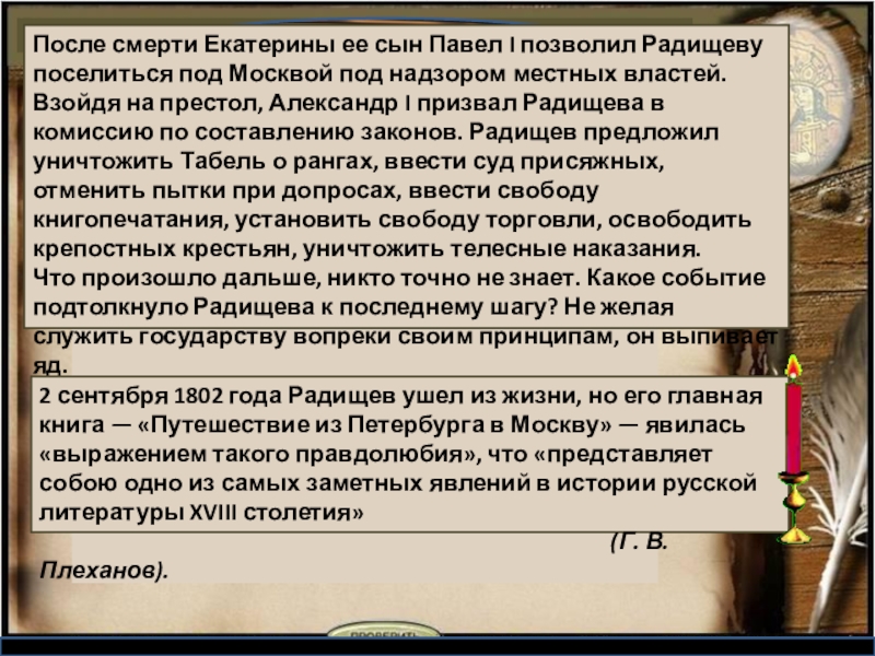 2 сентября 1802 года Радищев ушел из жизни, но его главная книга — «Путешествие из Петербурга в Москву» — явилась «выражением такого правдолюбия», что «представляет собою одно из самых заметных явлений в истории русской литературы XVIII столетия»