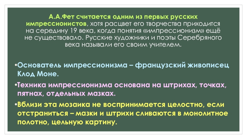 Техника импрессионизма основана на штрихах, точках, пятнах, отдельных мазках.