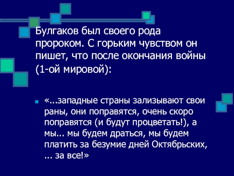 «...западные страны зализывают свои раны, они поправятся, очень скоро поправятся (и будут процветать!), а мы... мы будем драться, мы будем платить за безумие дней Октябрьских, ... за все!»