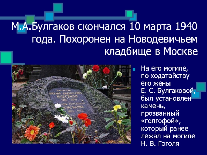 На его могиле, по ходатайству его жены Е. С. Булгаковой, был установлен камень, прозванный «голгофой», который ранее лежал на могиле Н. В. Гоголя